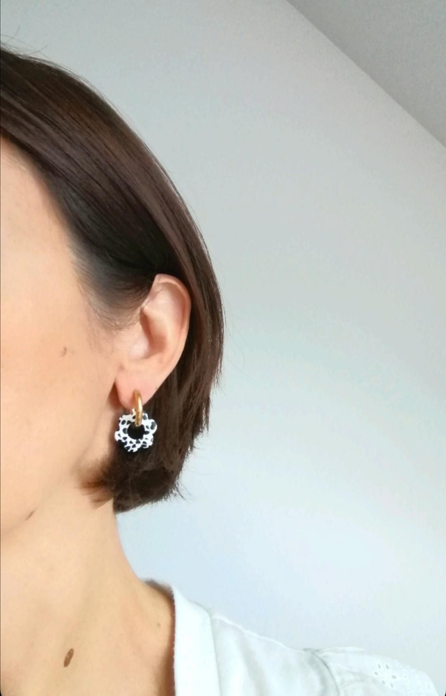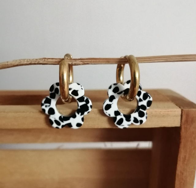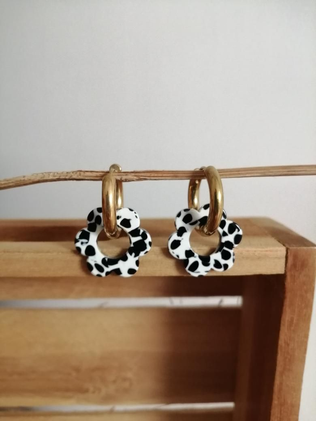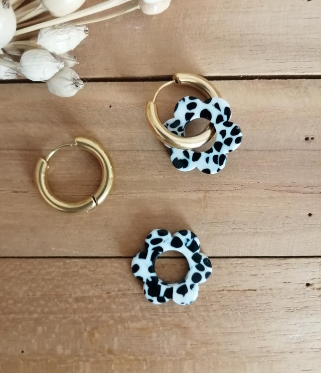 Boucles d'oreilles créoles rondes en acier inoxydable doré de 18 mm et perles fleurs en acrylique motif noir et blanc tacheté de 18 mm.