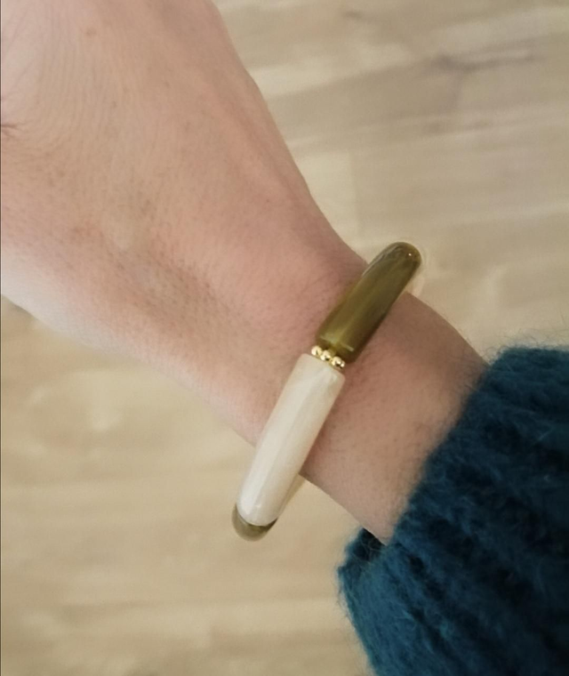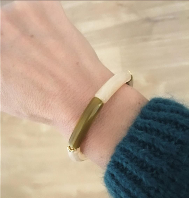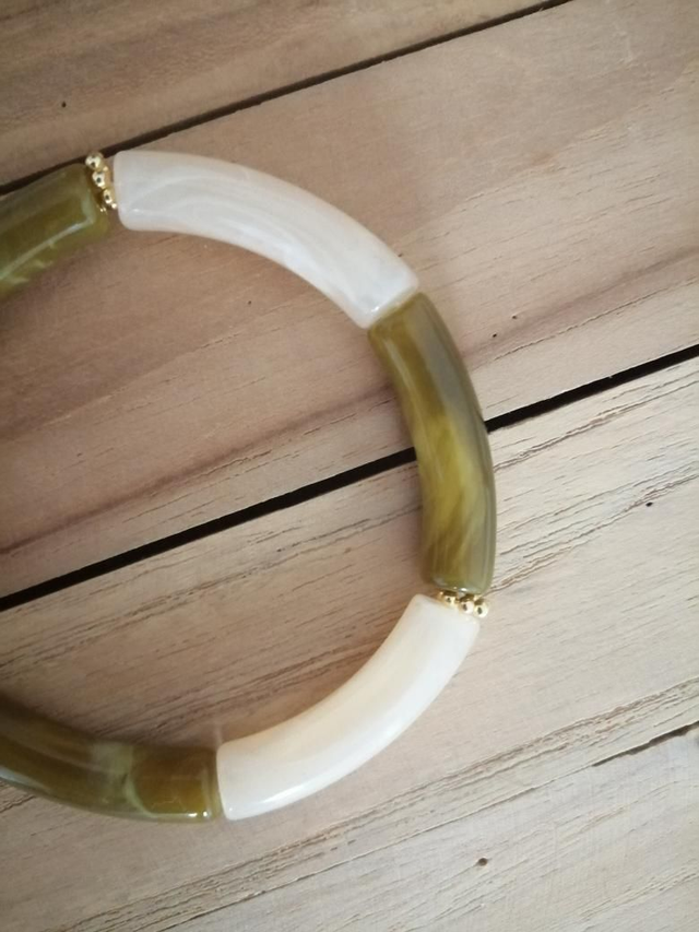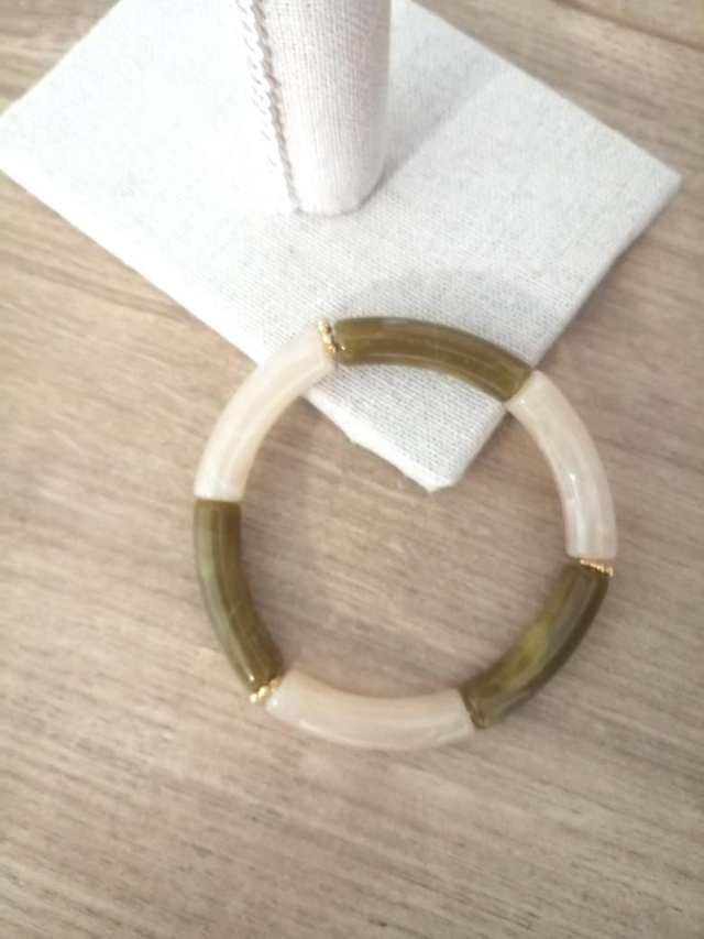 Bracelet élastique sur fil multi brins doublé, perles incurvées tube acrylique 32 X 8 mm vert olive, écru et perles rondelles en laiton.