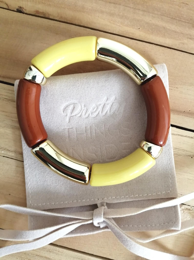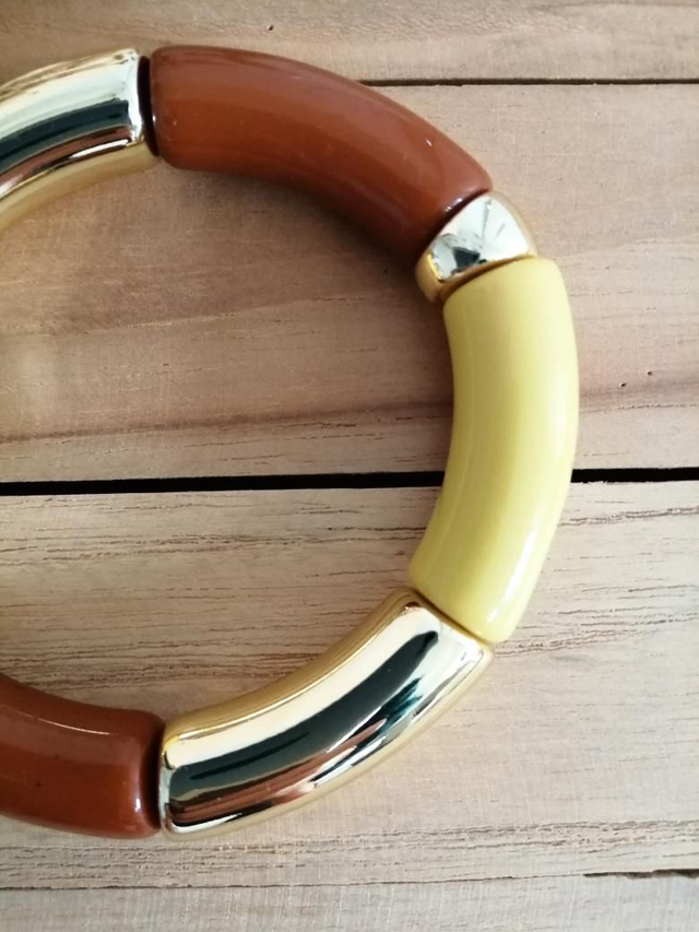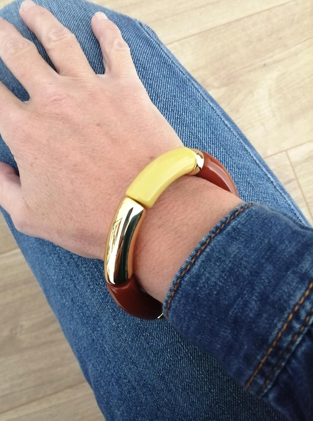 Bracelet élastique sur fil multi brins en double épaisseur, perles incurvées tube acrylique 35 X 11 mm marron clair mat, jaune moutarde mat, doré et perles rondelles épaisses en laiton doré.