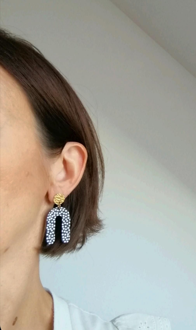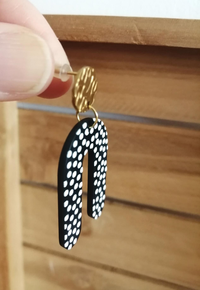 Boucles d'oreilles composées de puces d'oreilles martelées en acier inoxydable doré et de pendentifs forme U noirs à pois blancs en relief en résine d'acétate.