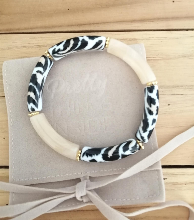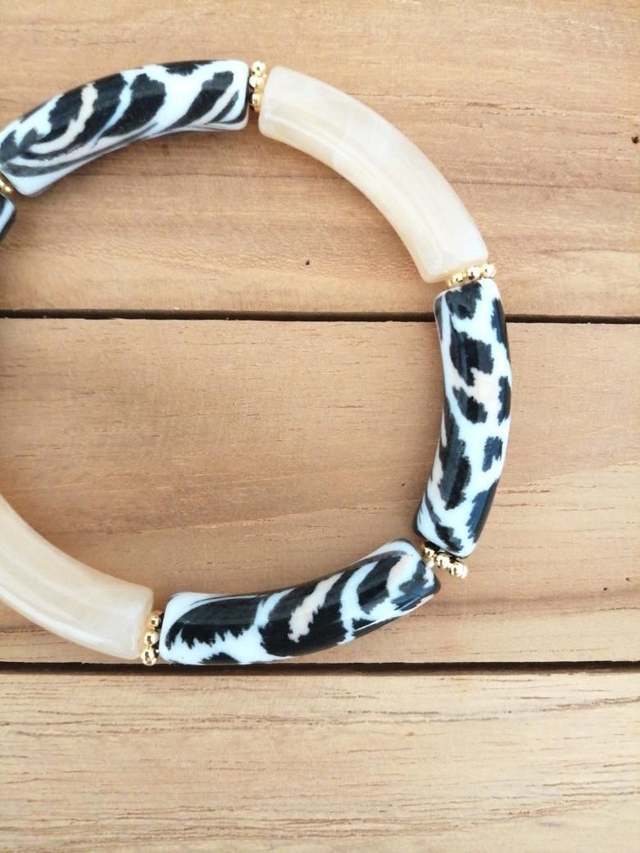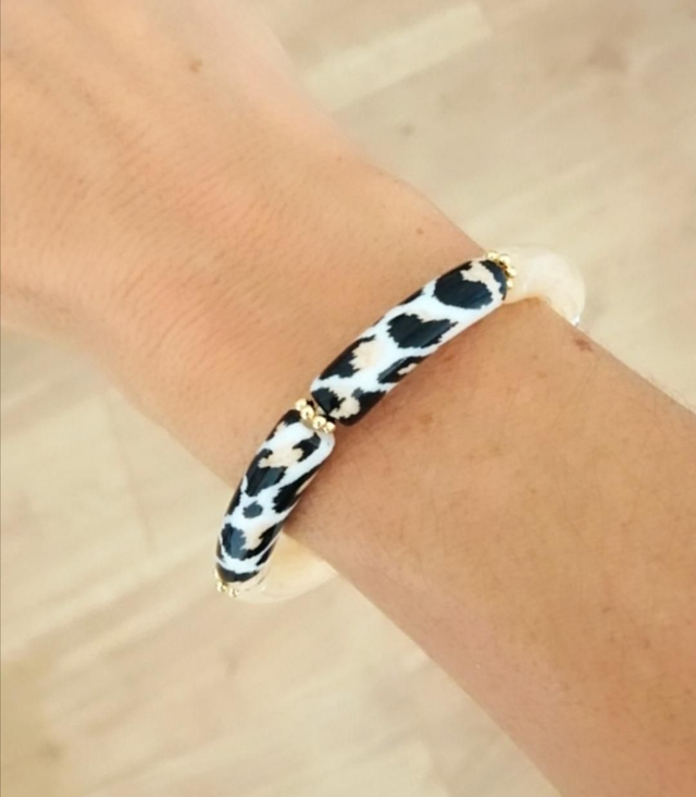 Bracelet élastique sur fil multi brins en double épaisseur, perles incurvées tube acrylique 32 X 8 mm beige marbré, léopard noir, beige, blanc et perles rondelles en laiton doré.
