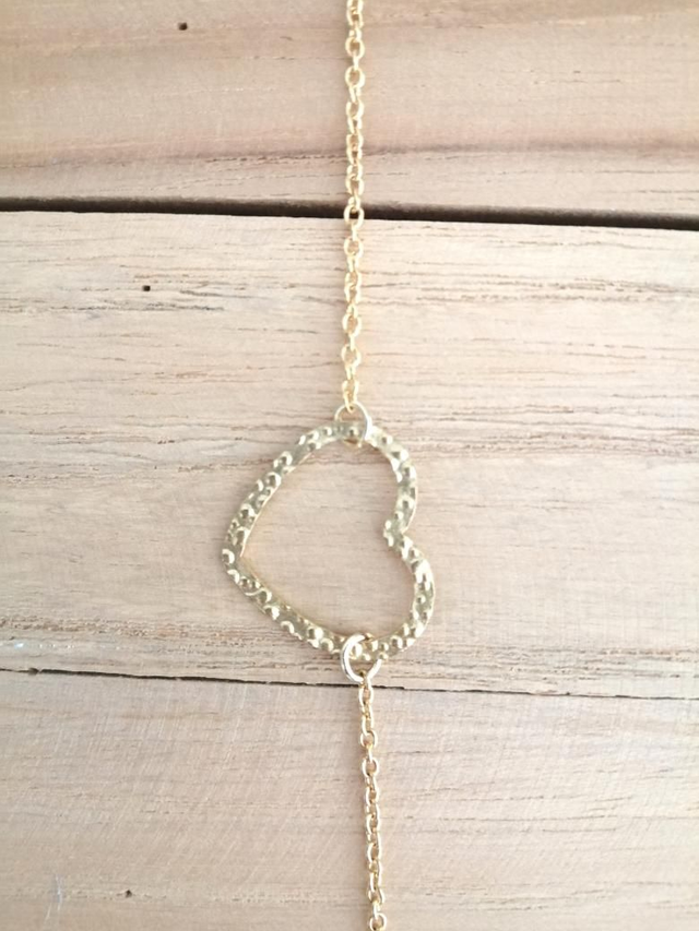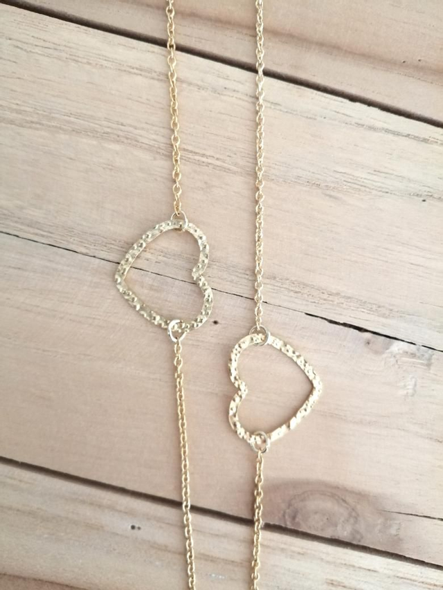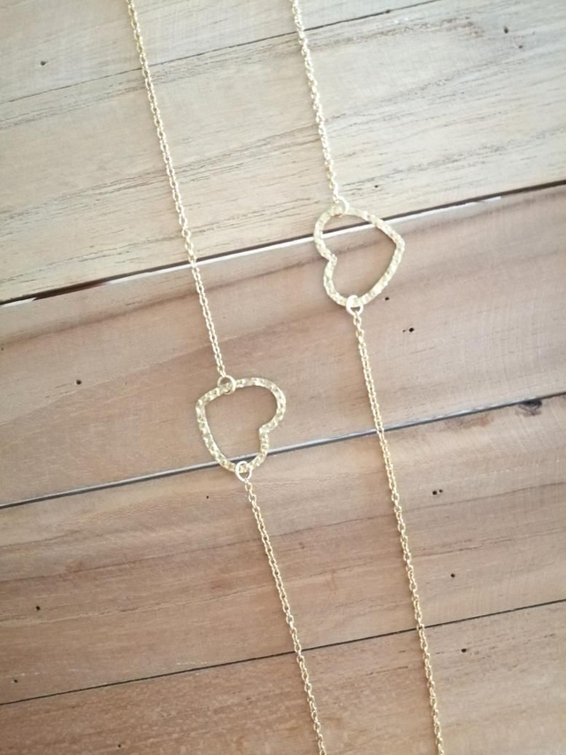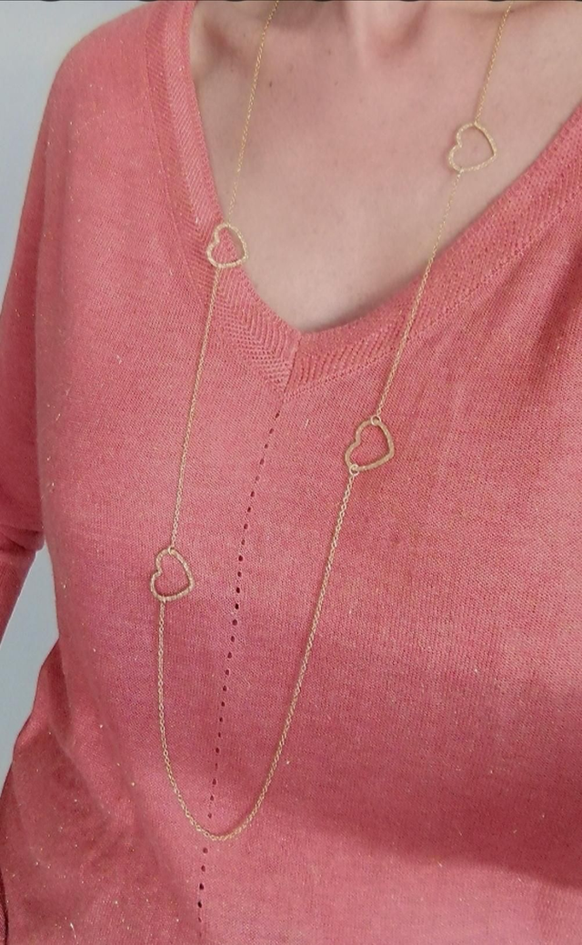 Collier long type sautoir chaîne maille forçat et 4 connecteurs cœurs en acier inoxydable martelé de 2 cm.
