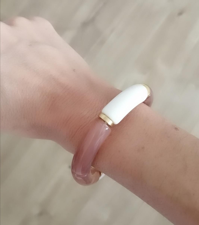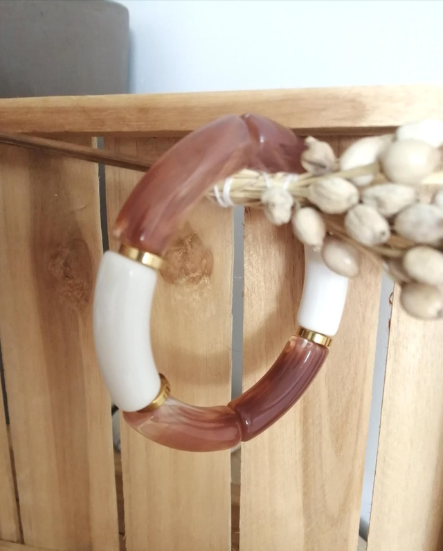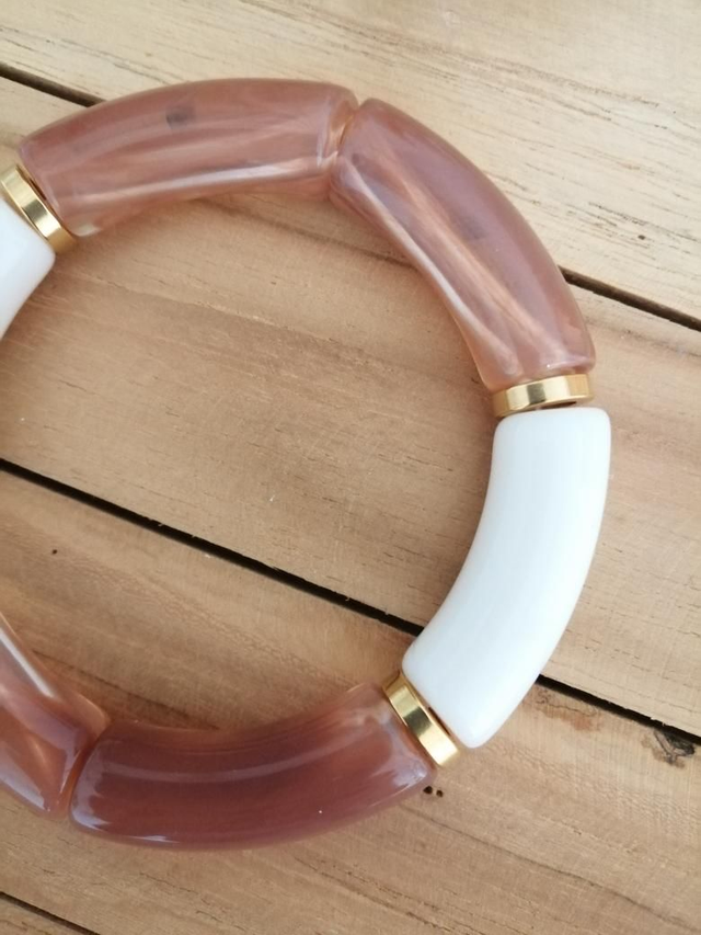Bracelet élastique sur fil multi brins en double épaisseur, perles incurvées tube acrylique 35 X 11 mm beige rosé transparent, beige crème et perles rondelles en laiton doré.