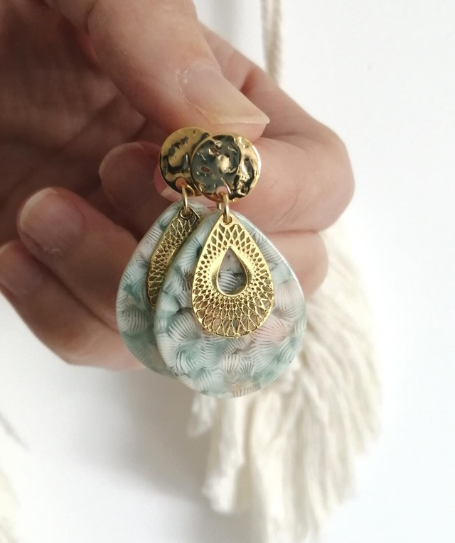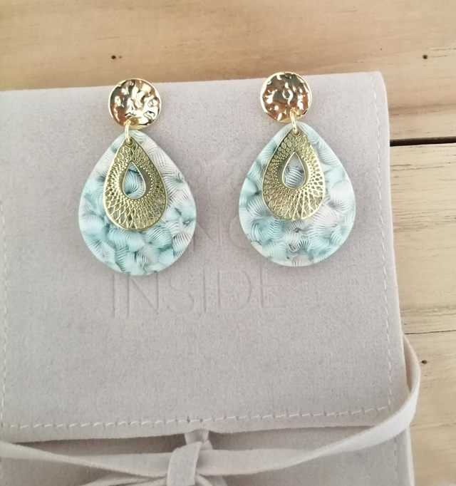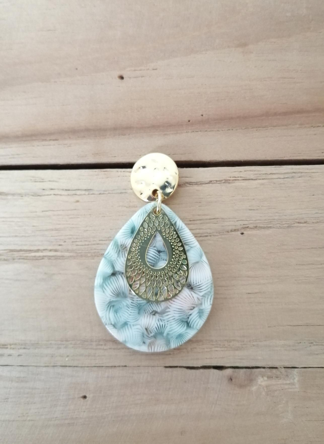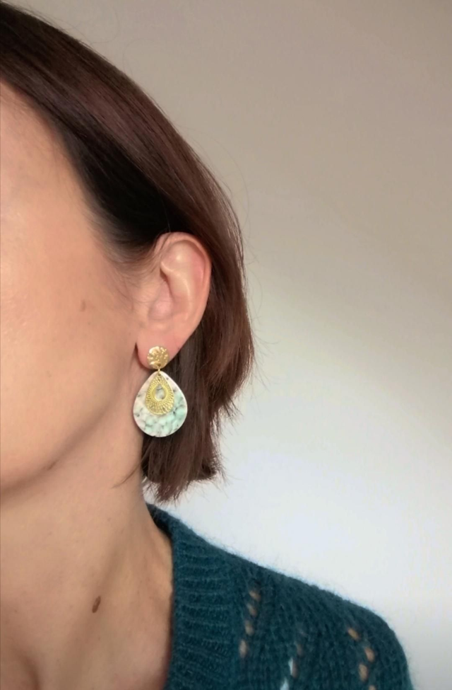 Boucles d'oreilles composées de puces d'oreilles martelées en acier inoxydable, de pendentifs gouttes en résine d'acétate motif légèrement fleuri vert d'eau et rose, et de pendentifs ajourés en laiton.