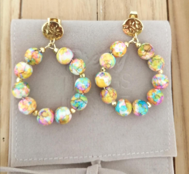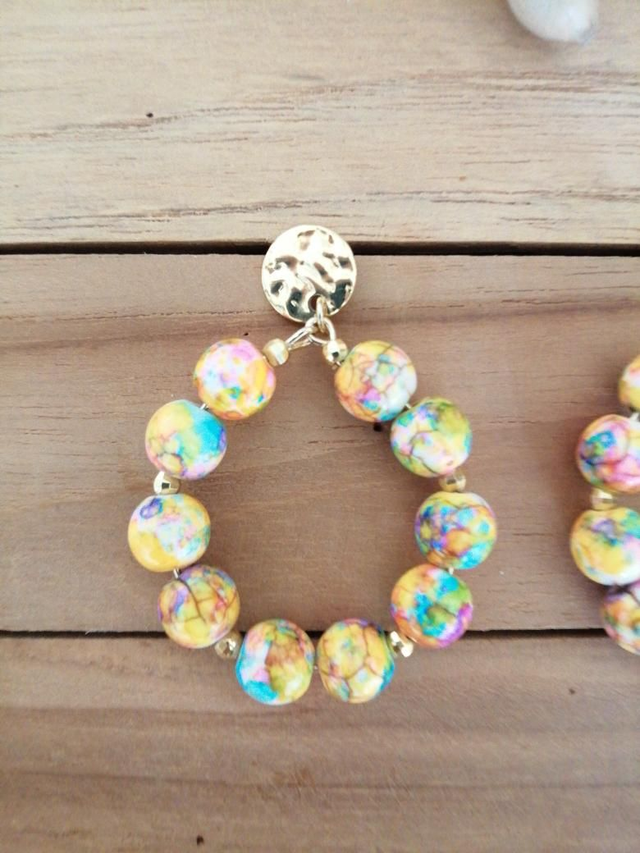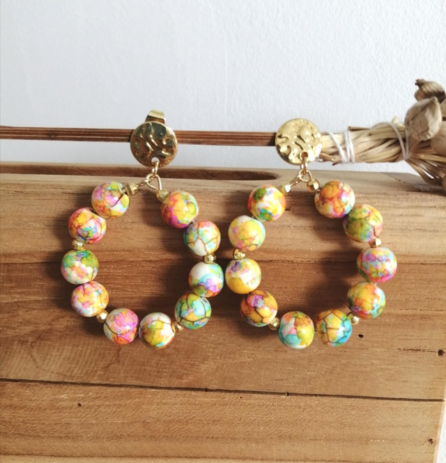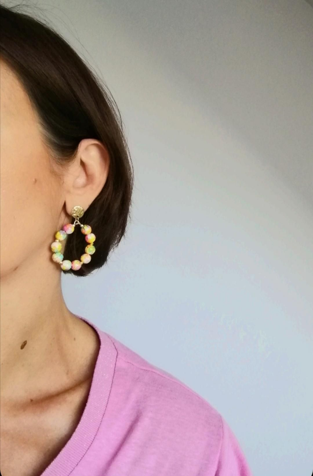Boucles d'oreilles sur supports créoles en laiton doré à l'or fin, puces d'oreilles martelées en acier inoxydable, perles multicolores jaunes, bleus, roses, blanches effet marbré de 8 mm et perles dorées en laiton.