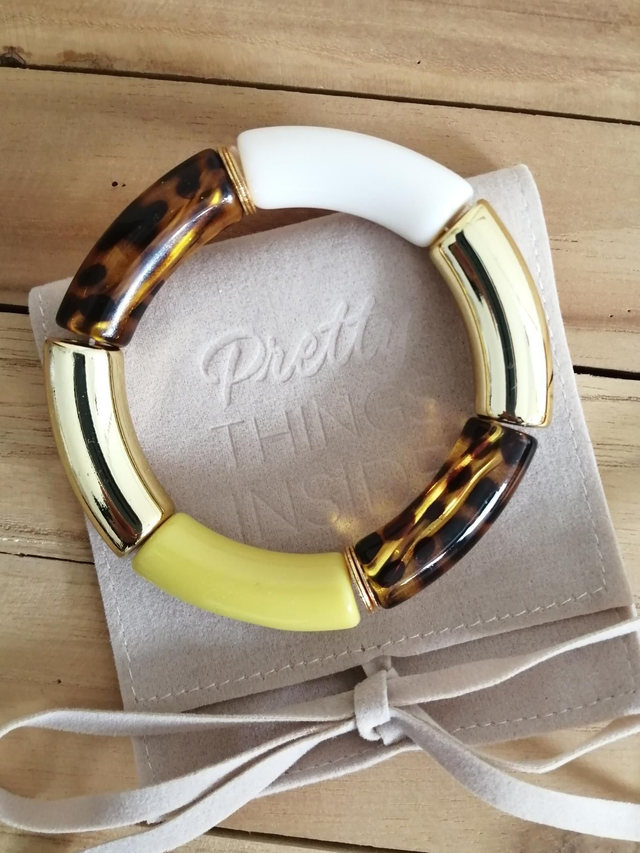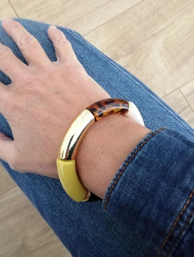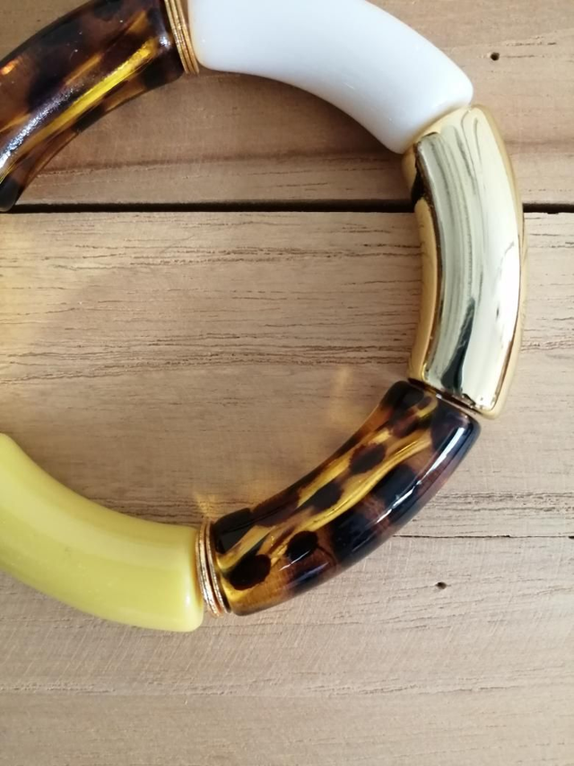 Bracelet élastique sur fil multi brins en double épaisseur, perles incurvées tube acrylique 35 X 11 mm beige crème, léopard marron transparent, doré, jaune moutarde mat et perles rondelles en laiton doré.
