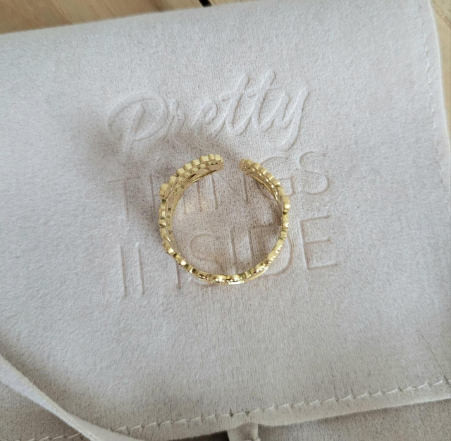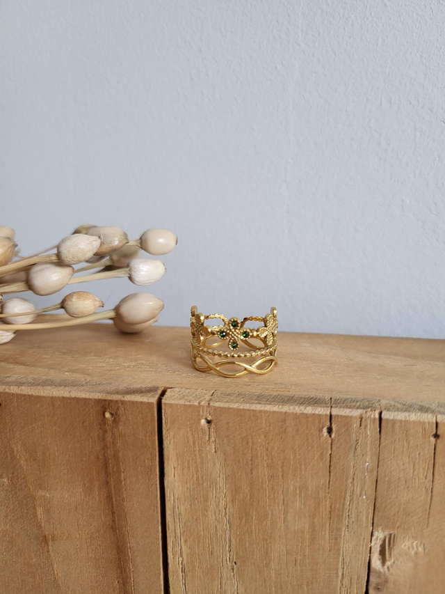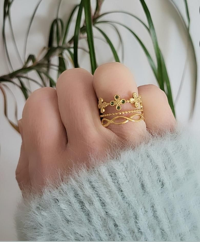 Bague multi-rang en acier inoxydable doré avec de petits détails de zircons verts.