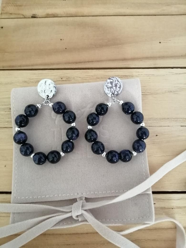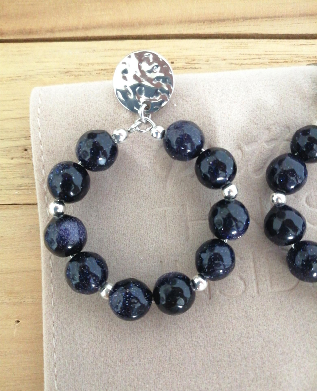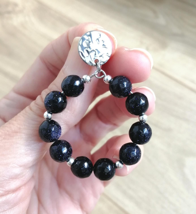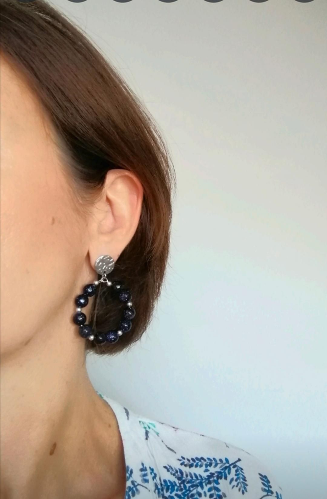 Boucles d'oreilles sur supports créoles en acier inoxydable argenté, puces d'oreilles martelées en acier inoxydable de 13 mm, perles facettées de 8 mm imitation pierre de nuit (bleu avec de légères paillètes) et perles argentées en laiton.
