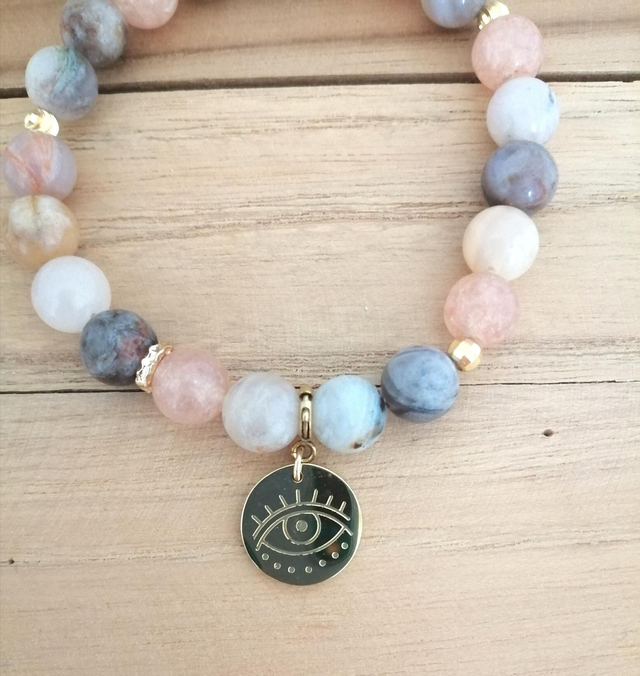 Bracelet élastique sur fil multi brins résistant doublé, perles de pierre d'agate naturelle et de calcite de 8 mm aux teintes naturelles de blanc, pêche, marron clair et gris doux, perles en laiton doré et breloque œil en acier inoxydable.