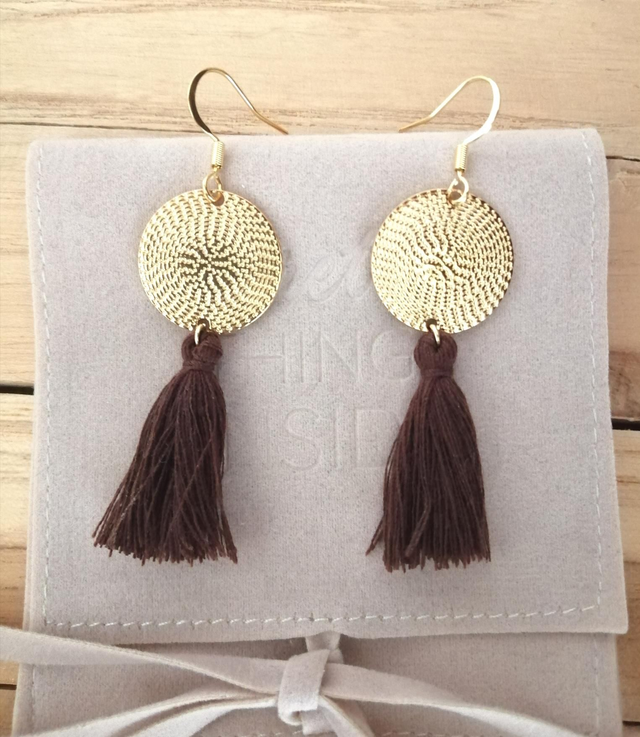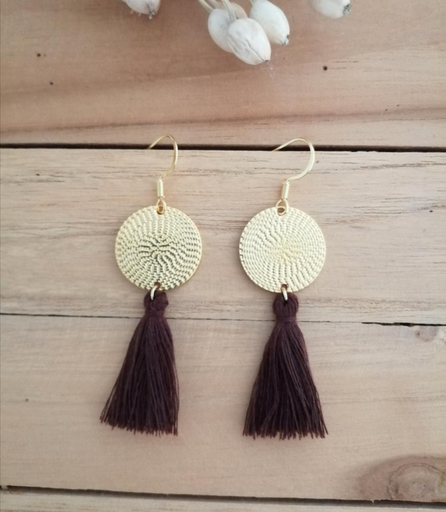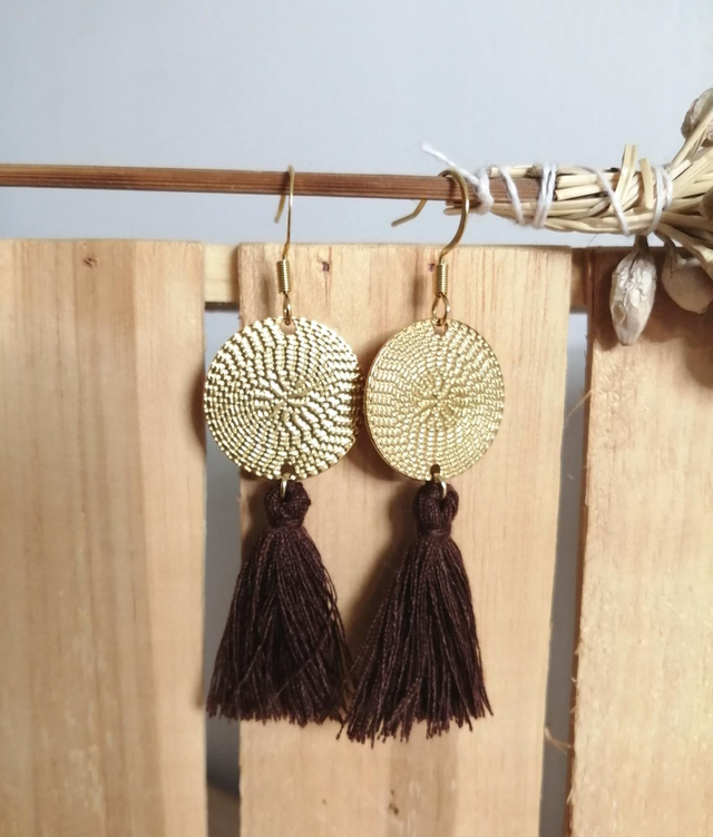 Boucles d'oreilles en acier inoxydable doré, connecteurs ronds avec des détails graphiques en acier inoxydable de 20 mm et pompons marron chocolat de 3 cm.