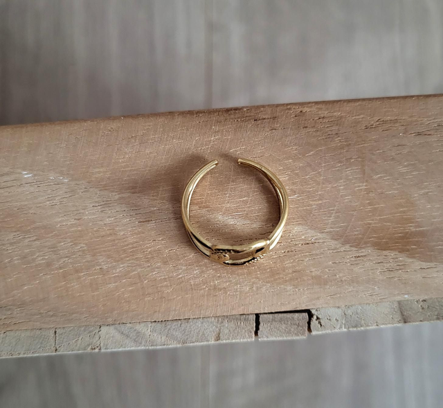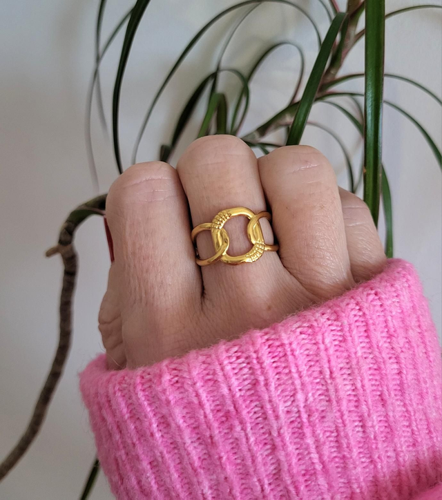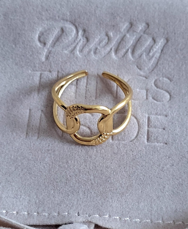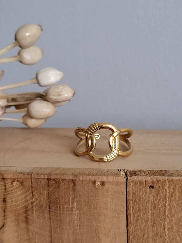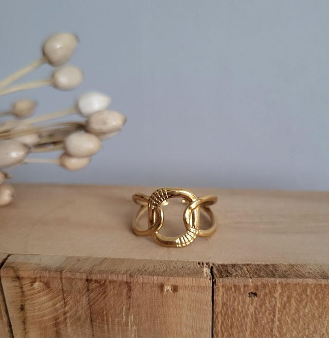 Bague réglable motifs maillons en acier inoxydable doré.
