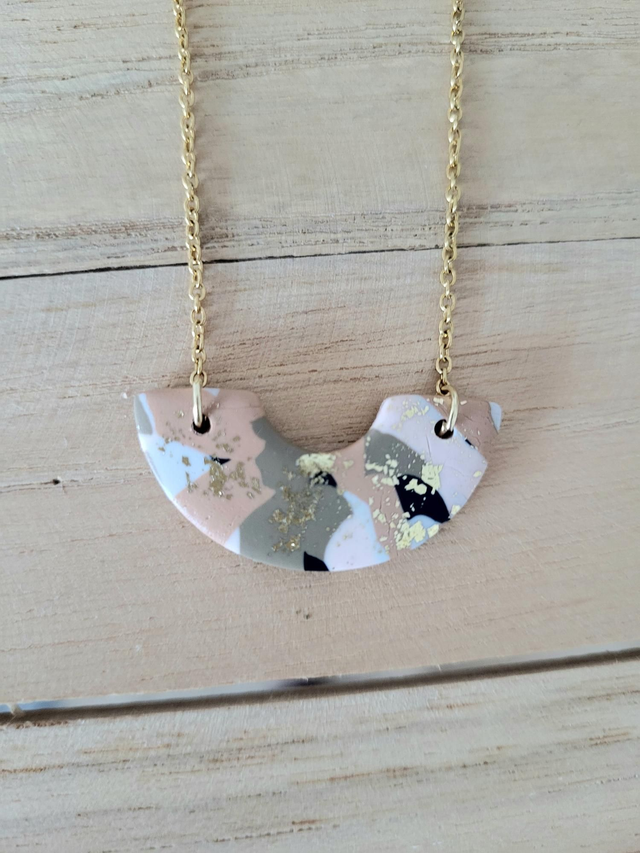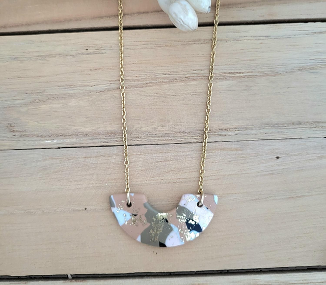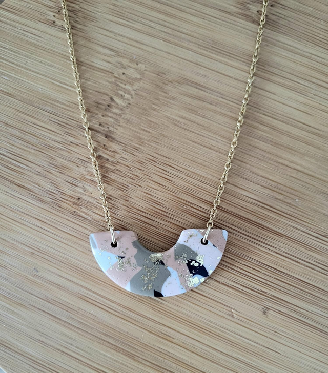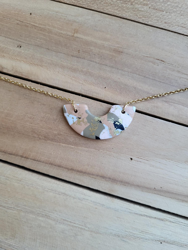 Collier composé d'une chaîne maille forçat fine et pendentif demi lune en pâte polymère beige, marron et noire avec des feuilles d'or, le tout recouvert d'un vernis gloss.