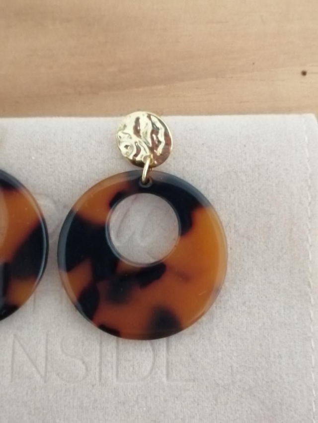 Boucles d'oreilles composées de puces d'oreilles martelées en acier inoxydable et de pendentifs ronds évidés en résine marbrée marron et noire de 30 mm.