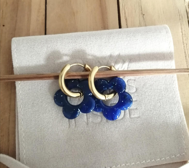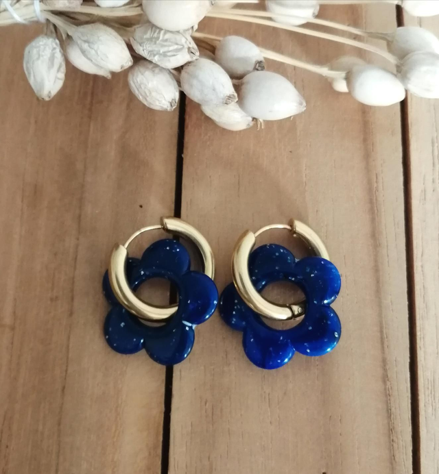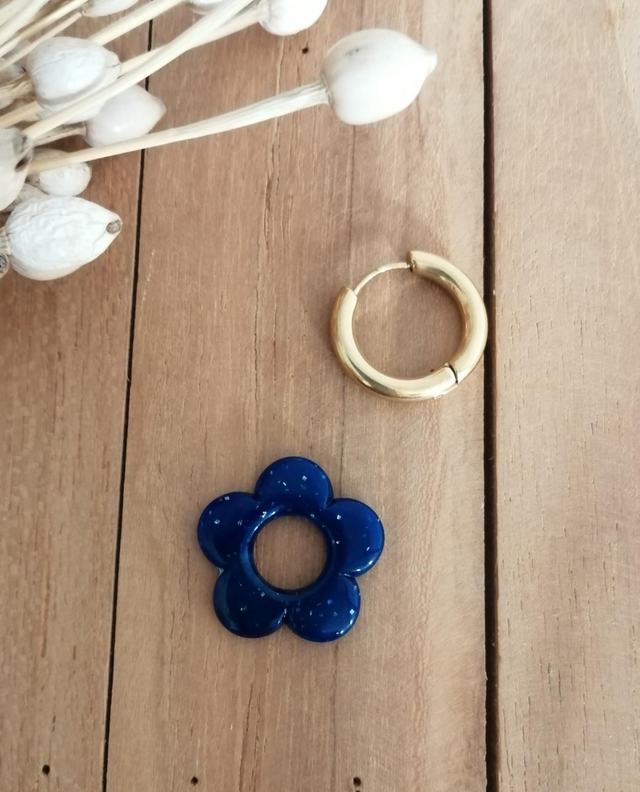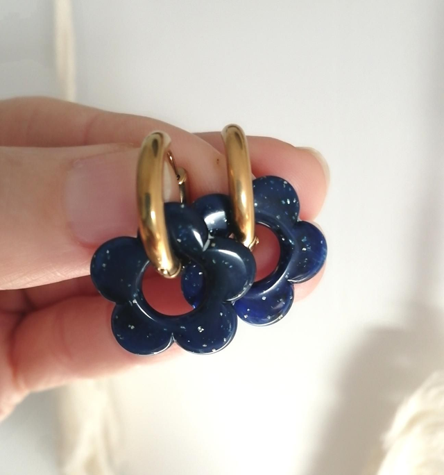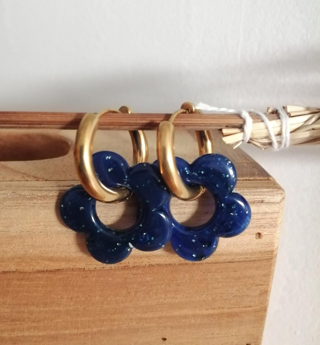 Boucles d'oreilles créoles rondes en acier inoxydable doré de 18 mm et perles fleurs en acrylique bleu marine pailleté de 21 mm.